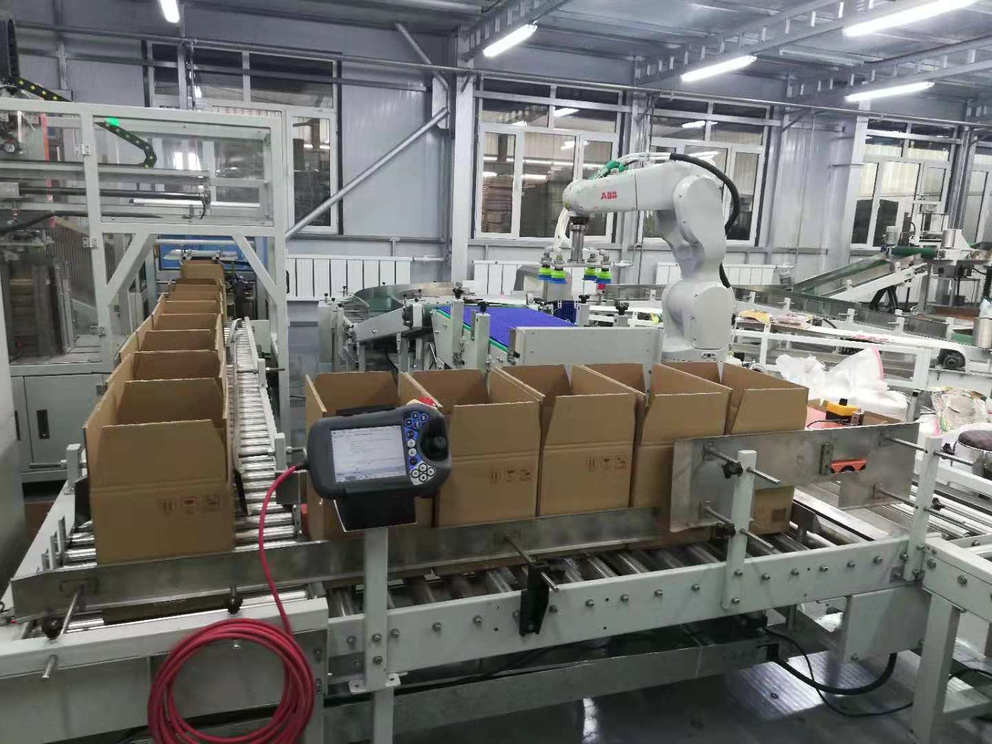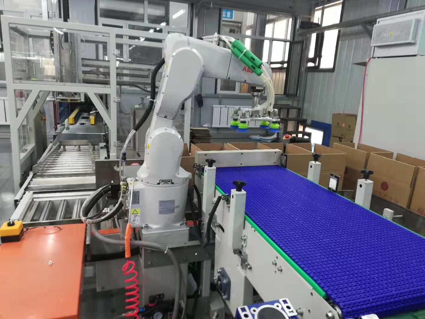 將產(chǎn)品通過進料輸送帶輸送進料,機器人及夾具到產(chǎn)品上方,抓取產(chǎn)品后移動到裝箱位,按事先輸入的裝箱形式進行產(chǎn)品裝箱。
