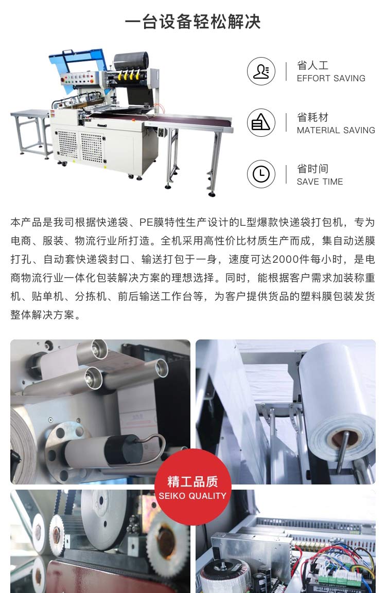 介紹:本產(chǎn)品是我司根據(jù)快遞袋、PE膜特性生產(chǎn)設(shè)計(jì)的L型快遞袋打包機(jī),專(zhuān)為電商、服裝、物流行業(yè)所打造。全機(jī)采用高性?xún)r(jià)比材質(zhì)生產(chǎn)而成,集自動(dòng)送膜打孔、自動(dòng)套快遞袋封口、輸送打包于一身,速度可達(dá)2000件每小時(shí),是電商物流行業(yè)一體化包裝解決方案的理想選擇。同時(shí),能根據(jù)客戶(hù)需求加裝稱(chēng)重機(jī)、貼單機(jī)、分揀機(jī)、前后輸送工作臺(tái)等,為客戶(hù)提供貨品的塑料膜包裝發(fā)貨整體解決方案。