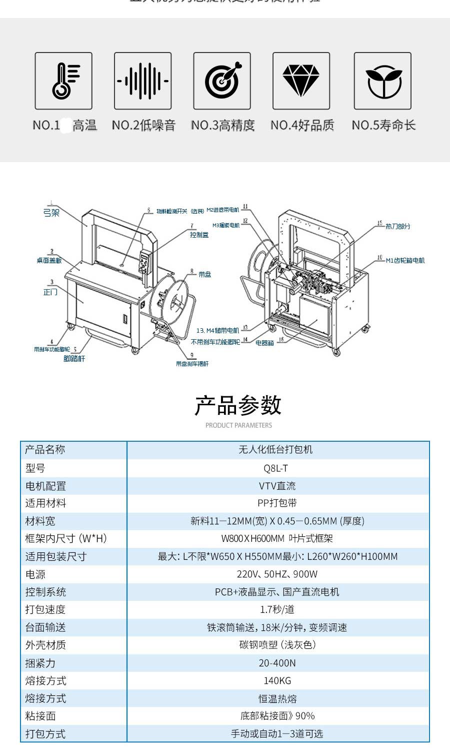 介紹:電機+減速機+凸輪+緊縮臂運作,捆緊力大,故障少,維修方便。 零部件均由電腦微控機床精密加工,機械動作柔和穩(wěn)定,耐久性,功能齊全,使用壽命長。 捆包結束后電機馬上停止運轉(zhuǎn),省電實用。 保養(yǎng)容易,免加油,機械堅固,操作簡單。 用途廣泛,可單機操作或配合其他機種,設計自動化與無人化的生產(chǎn)系統(tǒng)。 外型精巧、美觀、節(jié)省空間。 側式設計可避免機器接觸到水或其它污染物 打包機不脫帶,自動送帶 ?
