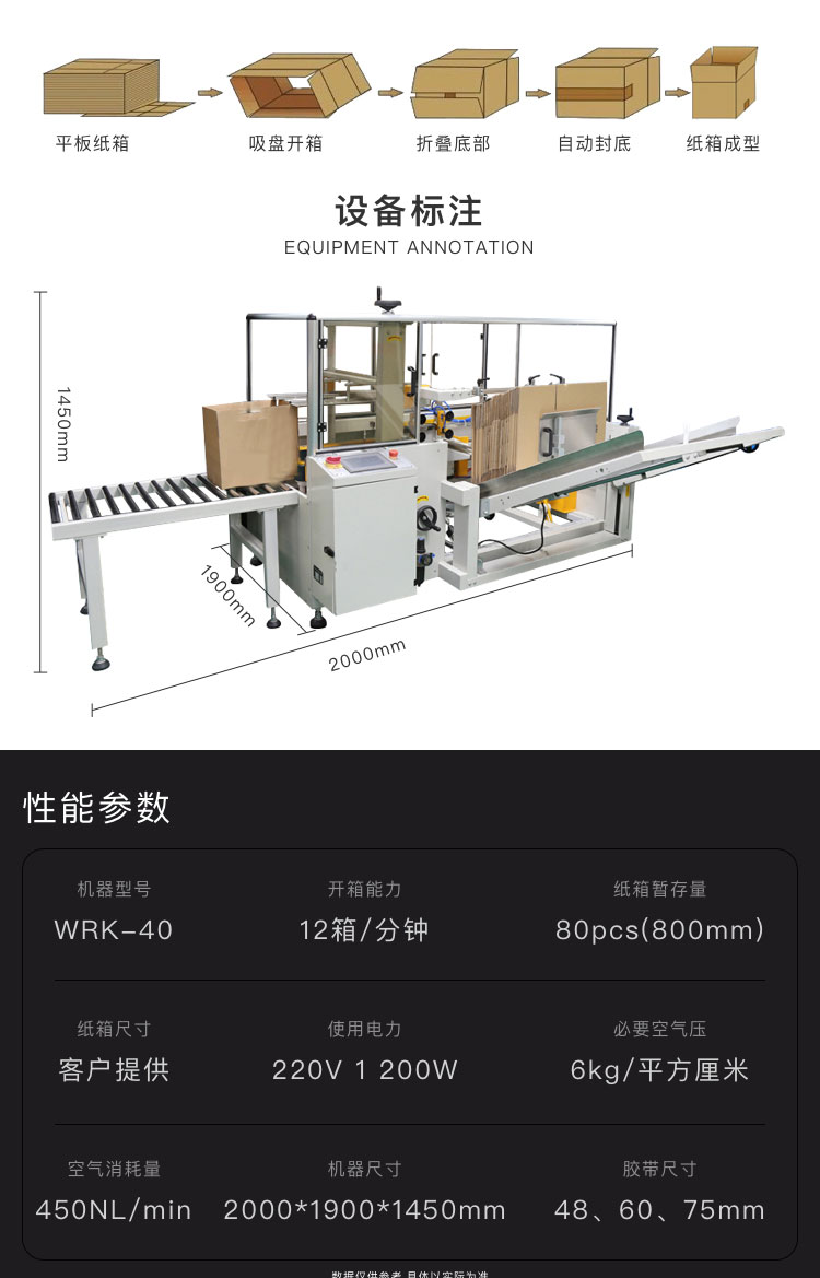 介紹:紙箱自動(dòng)成型封底機(jī)WRK-40立式開(kāi)箱速度達(dá)到12箱/分鐘的開(kāi)箱機(jī),與同級(jí)別立式開(kāi)箱機(jī)相比價(jià)格低50% 01: 紙箱自動(dòng)成型機(jī)采用獨(dú)立技術(shù)制造,并選用進(jìn)口零部件,電器元件及氣動(dòng)元件;采用立式儲(chǔ)存紙板方式,并可隨時(shí)補(bǔ)充紙箱板,不需停機(jī) 02: 封底機(jī)合理化設(shè)計(jì),同步吸取成型,招底與封底一次同步成型;體積經(jīng)巧,機(jī)件性能精密,運(yùn)作過(guò)程無(wú)振動(dòng),運(yùn)轉(zhuǎn)穩(wěn)國(guó)壽命長(zhǎng),效率高 03: 適用于同一時(shí)間同種紙箱尺寸包裝使用,如需變換紙箱規(guī)格,手動(dòng)調(diào)節(jié)即可,所需時(shí)間1-2分鐘, 04: 加裝適明有機(jī)玻璃防護(hù)罩,開(kāi)門自動(dòng)停止,避免操作意外