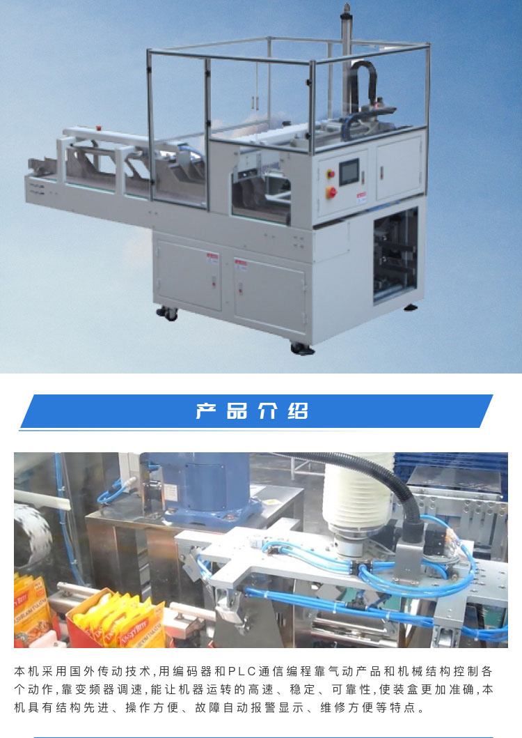 介紹:本機(jī)采用國外傳動技術(shù),用編碼器和PLC通信編程靠氣動產(chǎn)品和機(jī)械結(jié)構(gòu)控制各 個動作,靠變頻器調(diào)速,能讓機(jī)器運(yùn)轉(zhuǎn)的高速、穩(wěn)定、可靠。本設(shè)備可實(shí)現(xiàn)自動下料,開盒,關(guān)盒,黏膠等。 解決您的三大包裝難題實(shí)現(xiàn)自動化生產(chǎn):1、大大降低企業(yè)的生產(chǎn)成本,單臺裝盒機(jī)八小時生產(chǎn)力約為3-5萬盒,按此計算每臺裝盒機(jī)可省人工為10-15人;2、人工裝盒,易污染、易出差錯.車間多一人,更是多一個污染源.人工裝盒有時會漏裝說明書或內(nèi)容物;3、提高企業(yè)生產(chǎn)力,從企業(yè)管理角度上來講,管理人難,管理設(shè)備易。 產(chǎn)品別稱:裝箱機(jī)、裝盒機(jī)、自動裝箱機(jī)、自動裝盒機(jī)、跌落式裝箱機(jī)、側(cè)推式裝箱機(jī)、抓舉式裝箱機(jī)、機(jī)器人裝箱機(jī)、一片式裹包機(jī)、條形全自動裝盒機(jī)。